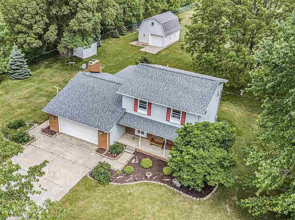 Country living at its finest Well cared for 3 bedrooms, 2 bath home, nestled off the road on 5 acres. Feel secluded with a variety of mature trees and woods at the rear of the property. Large Pole Building has electric with approx. 9000 sq ft fenced pen attached to the back, and a shed for additional storage. Soak up the sun and enjoy natures beauty in the Florida room Many updates including: bamboo flooring, carpet, newer roof, updated bathrooms, and septic pumped and inspected in June 2022 and looks good. Don't miss out on this one