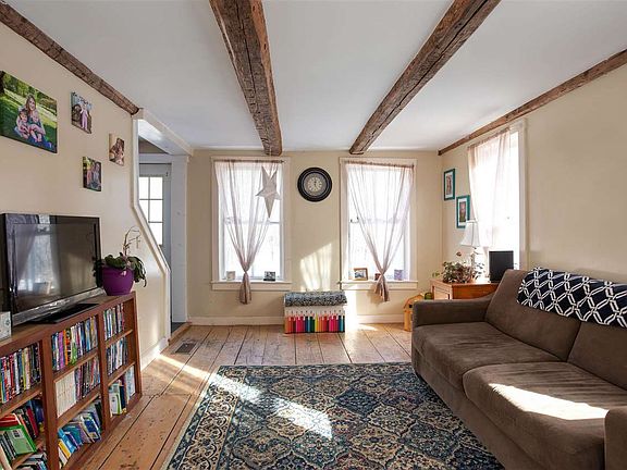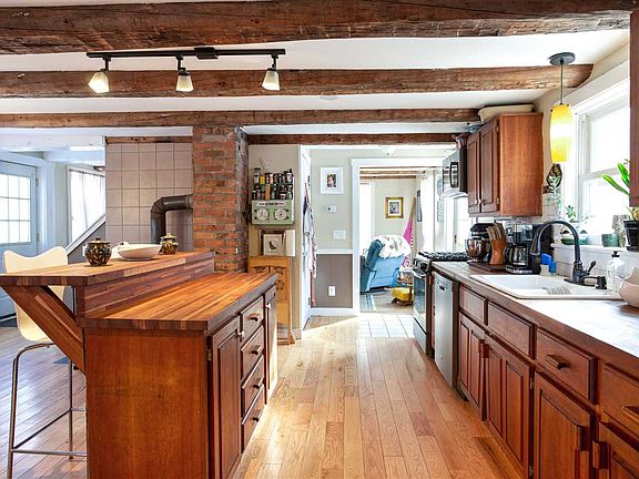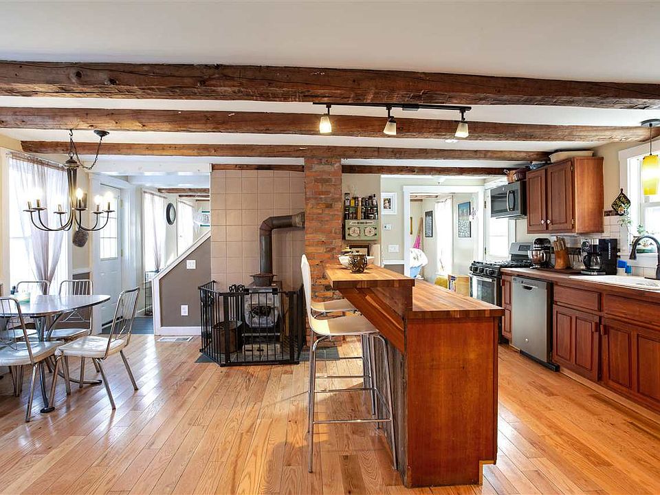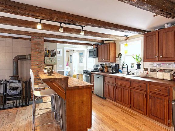 This beautifully renovated 1850's farmhouse is beaming with charm! The open concept kitchen is the heart of the home and offers gorgeous butcher block counter tops, graphite toned appliances, plenty of cabinet space and a cozy wood stove. The newer hardwood floors showcase the natural sunlight that pours into every room. The spacious master suite has ample storage and is just off the room that is currently used as a nursery. The present floor plan can easily accommodate additional bedroom space if needed. There is an attached shed for overflow and storage, plus two outbuildings: a barn, currently housing chickens, goats and Kunekune pigs (one of which is a bit of a celebrity at the annual Tunbridge Fair) and an additional shed for tools, a workshop or whatever your needs may be. The house was converted from oil heat to propane in 2016. The location is ideal - sited on a paved, well maintained road, just 10 minutes to Randolph Center, I-89 and Gifford Hospital.