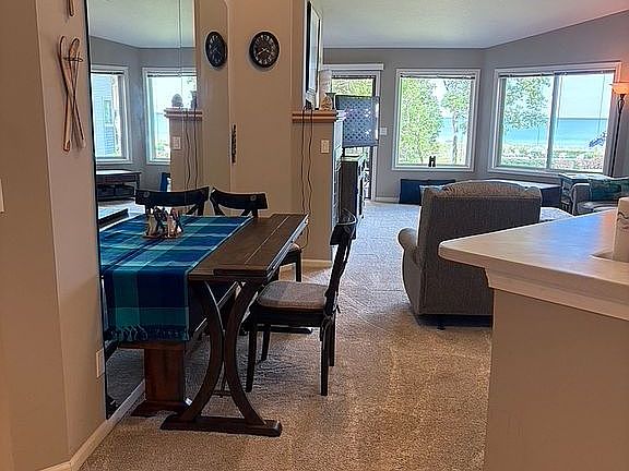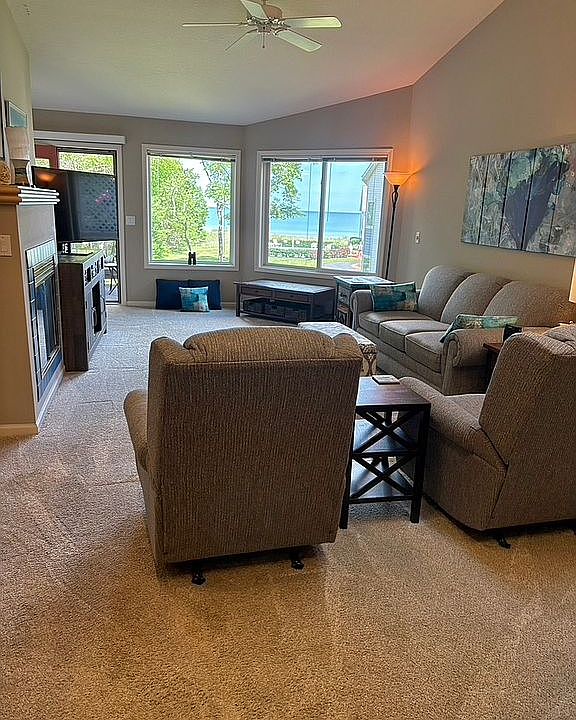 PINE RIDGE BAY CONDOMINIUMS ON LAKE HURON! SANDY BEACH! HEATED POOL! Many upgrades have been done as listed below: June 2015 Carpet replaced throughout condo January 2015: Honeywell Wifi thermostat installed October 2020: New Daikin furnace installed June 2021: New Frigidaire stove and microwave installed August 2023: New Larson screen door with retractable screen installed August 2023: Kitchen cabinet doors and hardware replaced and new solid wood drawers installed September 2023: new LG dishwasher installed April 2024: new Kohler kitchen sink, garbage disposal and Corian countertops installed in kitchen June 2024: new LG refrigerator and LG washer/dryer tower installed One of the top condominium complexes in Oscoda! It has beautiful grounds with 200 ft of waterfront, a sandy beach, many trees and a heated in-ground pool. It has beautiful views of the manicured lawn, pool and lake. It is a second floor unit with cathedral ceilings and skylights. Enjoy the view on the covered lake side deck. The kitchen is open to the living room/dining room so you can see the lake views while cooking. The large master bedroom (17’ x 13’) has a large ensuite bathroom with double sinks. There is a second bedroom (13’ x 12’) with adjacent full bathroom. A third room (10’ x 7’) is large enough for a bunk bed or could be used as an office.