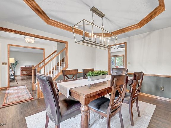 Step onto the inviting front porch and into a thoughtfully designed interior featuring solid wood details throughout. The formal dining room with an elegant tray ceiling and a living room greet you upon entry.