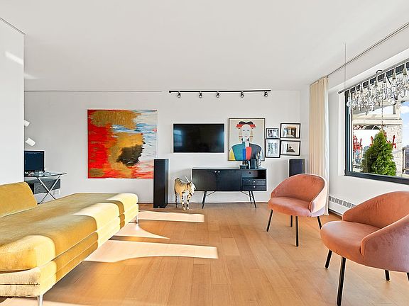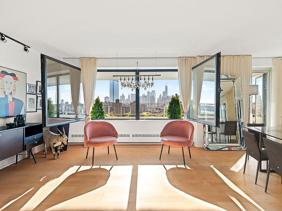 The most unique one bedroom in the entire coop! Grandfathered massive steel casement windows fully open onto a stunning 23 foot wide, 130 square foot terrace that overlooks the most beautiful vista of river, bridges and lower Manhattan. Brilliant light pours in to the large renovated living and dining rooms with wide plank floors and a sleek white lacquer kitchen with ample storage. Plenty of room to add a floating island and still retain a well-proportioned dining area. An ample office nook sits tucked just past the entrance foyer. The large one bedroom is currently used as a design studio with gorgeous floor to ceiling industrial-style glass and steel walls with French doors and a large closet. This room can easily be reconfigured into a king bedroom with walk in closet (see alt floorplan)! A windowed mosaic tiled bathroom completes this welcoming home.