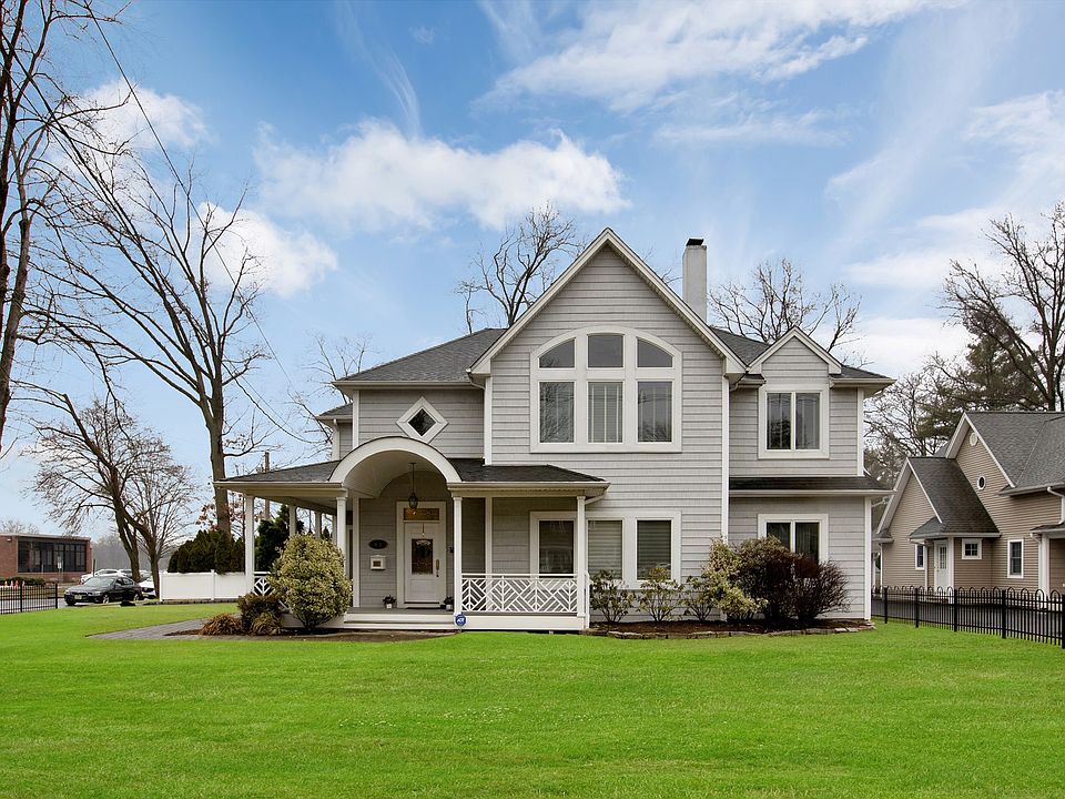 Immaculate side-hall colonial (new construction in 2007 on existing foundation 1950)with wrap-around porch and soaring 2 story entry. 5 bedrooms, 4.5 baths. Attention to detail throughout. 9 ft. ceilings on first floor, elegant eat-in kitchen with Italian cherry wood cabinetry & granite counter-tops and top-of-the-line appliances (Viking, Meile, etc) overlooks the bright & airy family room. Office/bedroom on first floor has separate exterior entrance and full bath. Living room w/frplc, hardwood floors throughout,tray ceilings,recessed lightning, finished basement w/rec room & full bath. 2-car attached garage (entrance on Hamilton), paver patio & driveway, central vac, multi-zone heat & AC. Convenient to schools & NYC transportation. Private deep fenced in level backyard.