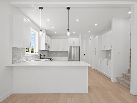 Large u-shaped kitchenStainless steel appliancesEating peninsulaLaminate flooringHigh-efficiency heat pumpModern heat pump tankSingle-car ev ready garage
