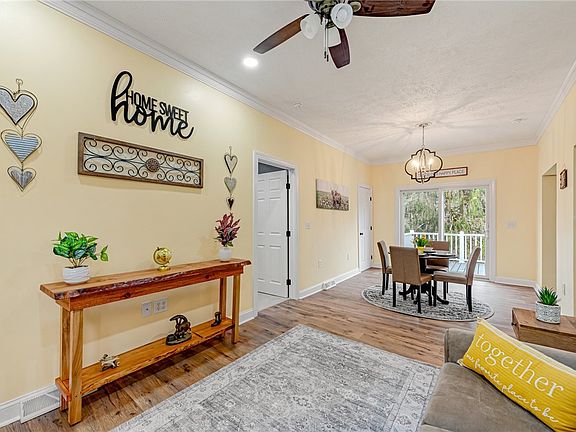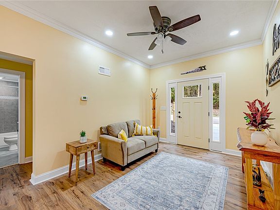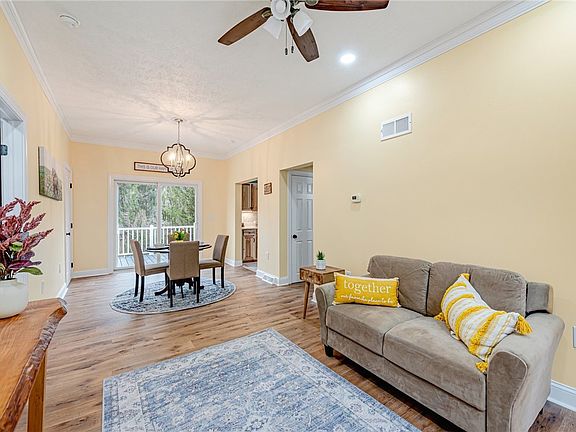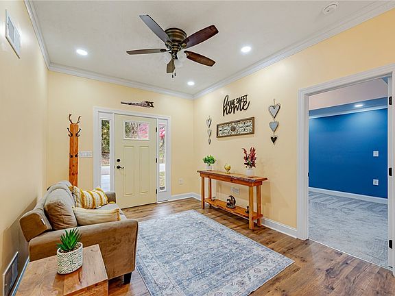 WOW! This home just got a total makeover. Exterior front has new landscapping, concrete sidewalks, and patio. All new concrete (Hardy board exterior), new windows and new metal roof!! All drywall has insulation behind them to save on energy bills. Kitchen has beamed ceilings, new maple cabinets, under counter lighting, backsplash, Quartz countertops, deep composite sink, and Tiffany light. New stainless appliance include a gas stove with griddle. The living room/ dining combo has new sliding doors leading to the rear Trex Deck, overlooking woods, walking bridge, and a creek flowing thru the property. New laminate wood flooring, recessed lighting and a ceiling fan. Main bath has hexagon ceramic flooring, barn door style vanity and tiled bath surround. Master bedroom has en-suite, reading lights, vaulted shiplap ceiling, walk-in closet. 3rd bedroom has luxury vinyl flooring and its own full bath also, with walk-in shower! two more lower rooms, could be office and gameroom!!
