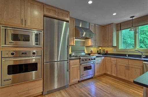 Meticulously cared for w/ an open concept, this home has a private natural setting in a convenient commuting location. The home features a gorgeous high end gourmet kitchen renovation w/stainless appliances, Viking gas stove, brushed granite countertops & custom cabinetry. French doors lead to an Azek deck w/awning. White oak flooring has been skillfully installed througout. There is a newer tankless Rinnai water heater, a brick fireplace w/ new flues & stainless cap, Central vac & Central air!