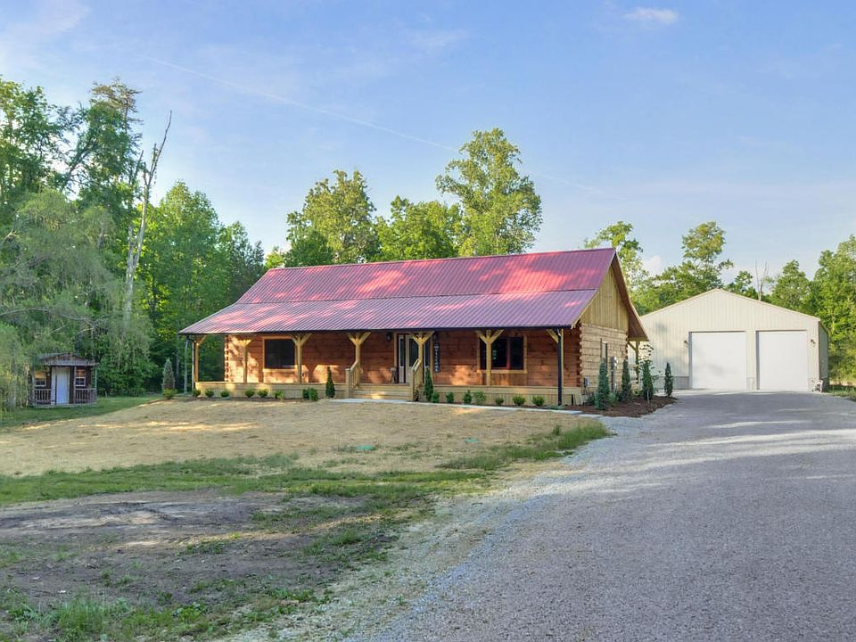 Check out this beautiful custom log home sitting on 10 acres! Great room, kitchen and dining room open for awesome entertaining. Beautiful stone fireplace and hardwood flooring throughout main level, custom maple kitchen cabinets and large island. Master suite has 2 large closets and master bath has soaker tub, separate tiled shower and 2 vanities. Covered porch on front and back with fans. Basement is finished with family room, custom bar, vinyl plank flooring that leads out to a 10x20 covered courtyard. 2 pole barns, 40 x 60 with 3 overhead doors, insulated, separate electric and porch. The other is 30 x 40 with additional 10 x 20 attached and oil furnace with separate electric. If you want privacy, this is the place to be. Minutes from I 65. Call today for your private tour.