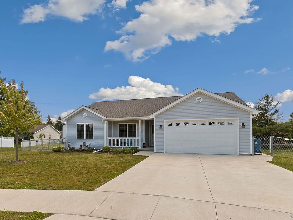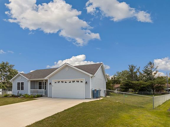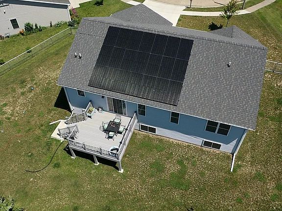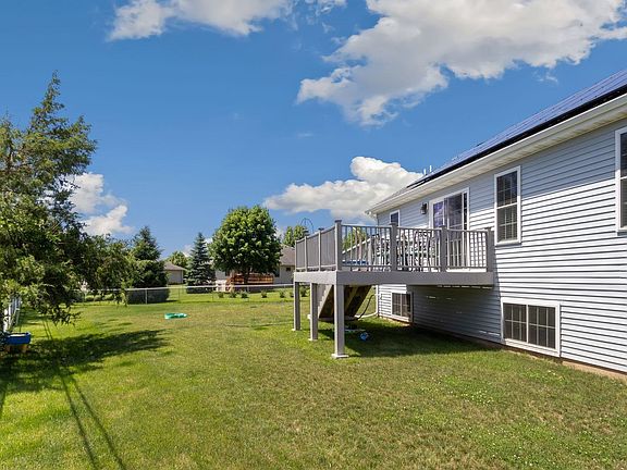 Nestled in a quiet cul-de-sac on the north side of town, this modern open-floorplan ranch offers an ideal blend of convenience and comfort. Enjoy main-floor laundry and a maintenance-free Trex deck, perfect for appreciating the sounds of nature in your large, fenced-in yard. The home features a master suite, upgraded granite countertops throughout, a soothing paint scheme, and premium stainless steel appliances, including a 3-rack dishwasher, WiFi oven with an integrated air fryer, and a stacked WiFi washer and dryer. A wall-mounted 75" TV and stand with an electric fireplace are included. Recent updates in 2023 include a new roof, an 8.4 kW solar system capable of powering the house and an electric car, and radon mitigation. The 2-car garage is electric car ready with two 240V outlets, and the upgraded concrete driveway has an additional pad for trash and recycling bins. Additionally, the home boasts a huge unfinished basement with egress windows, offering potential for extra living space to be finished to your liking. High-efficiency furnace, AC, water heater, and water softener complete this move-in-ready home. Don't miss the chance to make it yours!