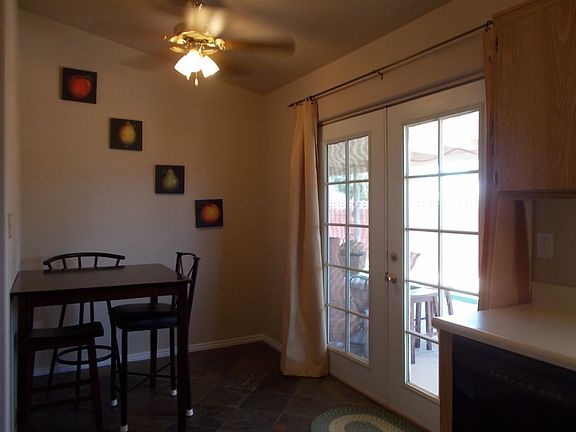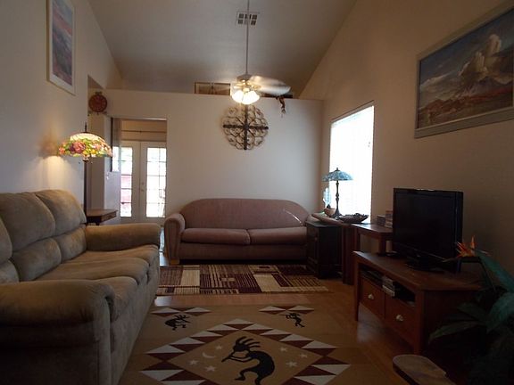 FULLY FURNISHED....what an opportunity for a fully furnished winter time getaway with two pools just steps from the home !!! One of the few homes in this subdivision that has VIEWS of the Mountains from your own backyard. Large covered patio extends the entire length of the home. Master Bedroom Suite has it's own walk-out slider to the patio. Master Bathroom is exceptionally wide and very spacious. Master Bedroom can accommodate a King Size bed with two large end tables. Vaulted ceilings in the living room make for an inviting feeling. Kitchen has French doors that open out to the patio. Carpeting is in excellent condition. Backyard faces east so you can use your backyard year round for entertaining. Low maintenance yard has desert landscaping and astro turf so no maintenance is required. Lock it up and go away with not a worryMaster Bedroom Set is excluded from the sale. Very well maintained home. RV Parking available in subdivision for homeowners....what a huge perk!!!