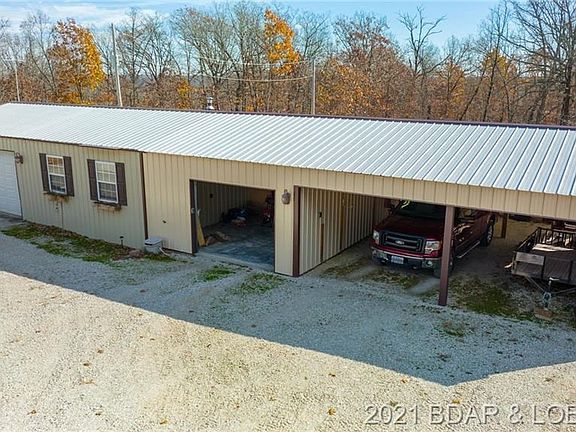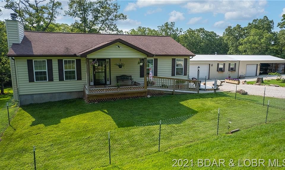 Private country home on 8.5 acres close to Ha Ha Tonka State Park. Home has been very well maintained and built offering 2x6 exterior walls and has a detached 80x23 Garage/Shop w/ wood burning stove, water, Half bath & electric. Home offers 2700sqft of living space with open kitchen/living/dining area with skylights and main level living, tile floors in kitchen, dining, baths & master bedroom, hardwood floors in main level living area with beautiful stone floor to ceiling fireplace, large screened in deck off dining area and half bath w/ laundry complete upper level. Lower level has 2nd living area with wood stove, laminate flooring, 2 conforming bedrooms, full bath & 1 non conforming bedroom,. lower level walks out to covered patio. Portion of the front yard is fenced and circle driveway. Lots of natural landscaping and wildlife.