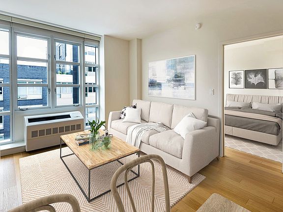 Within the unique facade of The Union Williamsburg apartments for rent are vast brightly lit apartments that offer room to liveand live it up. Light pours in through oversized windows, some spanning from floor-to-ceiling, and across the warm-toned hardwood flooring to create a luminous setting. The kitchens are the envy of designers and chefs alike with high-style and high-performance elements that include white matte custom cabinetry and gleaming stainless steel appliances. The Caesarstone countertops at these Brooklyn apartment rentals are spacious enough for all your gourmet pursuits and glamorous enough to play bar for a night during parties. Spacious bathrooms feature cool subway tiling, custom vanities and tremendous storage space.