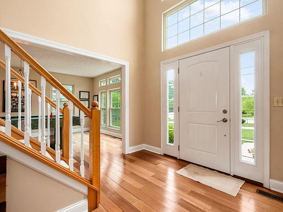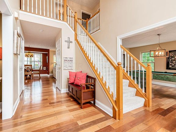 Step inside this bright, spacious home w/hardwood floors throughout the 1st floor and new windows that flood the space w/light. Flex spaces to your right & left can be used for living, dining or home office. The wide open kitchen, eating area & family room w/fireplace have plenty of space for gathering/entertaining yet are cozy too! White cabinets, SS appliances & an island make this kitchen easy to use & enjoy. Off the kitchen is the huge private deck with fire pit area and patio. Upstairs the wide 2nd story landing leads to large owner's suite, updated generous bath w/lg soaking tub and lg. walk in closet, 3 additional large bedrooms and hall bath. Partially finished basement is ideal for hanging out or working out with tons of storage. (Price reflects need for new carpet on 2nd story)