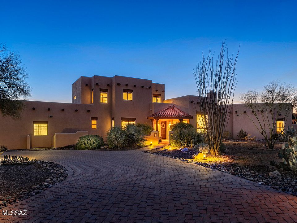 Wonderful Santa Fe on a spectacular, private view lot with mountain and sunset views and adjacent to the wash. This 4 BR/4BA gem features tongue and groove wood ceilings, beautiful vigas and corbels and views from every window,. Stunning newer eat in island kitchen w/SS appliances and quartz countertops which opens to the family room. Cozy living room with beehive fireplace and views of the Catalinas. Spacious Master Suite features fireplace, walk in closet, entrance to outside and is located downstairs. Step out to the large covered patio, perfect for entertaining and enjoy all the views. So much storage in this home, oversized 3 car garage with one bay designed for a RV. This gorgeous home has been meticulously maintained. Solar is seller owned.