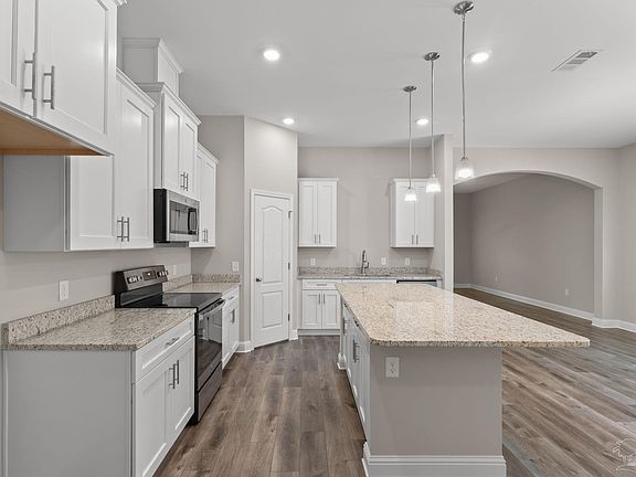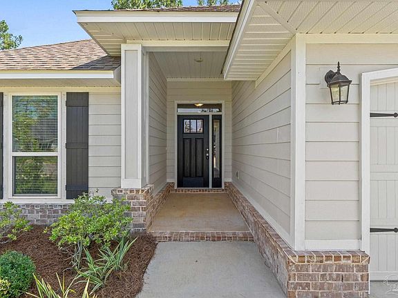 Welcome to this beautifully maintained 1,994 sq ft, 3-bedroom, 2-bathroom home in the sought-after Stonechase subdivision. Built in 2021, this home blends modern upgrades with timeless comfort. The foyer leads into the open kitchen, where white shaker cabinets, granite countertops, stainless steel appliances, and a large island create the perfect space for cooking and gathering. Just off the kitchen, the bright living area features a cozy fireplace and beautiful, durable LVP flooring. The split floor plan provides privacy, with all bedrooms carpeted for comfort. The primary suite is a true retreat with vaulted ceilings, a huge walk-in closet, and a spa-like ensuite bath with a soaking tub, separate shower, double vanity with granite, and a sunny privacy window. Arched doorways add charm, and double doors open to a covered patio overlooking a large backyard with mature shade trees and a tall privacy fence, ideal for outdoor living. Additional highlights include brick on three sides with Hardiboard front, fabric hurricane shutters stored in the garage, a termite bond, and a spacious laundry room. With HVAC, roof, and water heater all just three years old, this home is move-in ready and offers peace of mind in a quiet, gated neighborhood close to shopping, dining, and top-rated schools. Reach out today to schedule a showing!