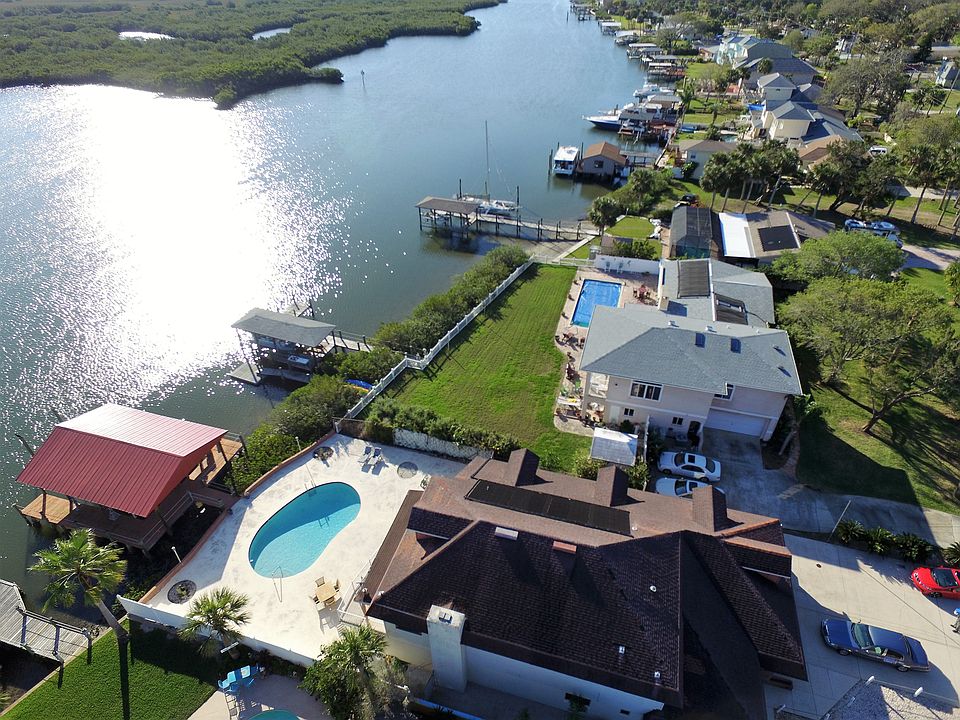 MOTIVATED SELLERS Offering this AMAZING CUSTOM BUILT ENTERTAINMENT RIVERFRONT POOL HOME, WITH BOAT HOUSE. Deep Water Dock/Double Slip Boat House With 10,000 Lbs Remote Controlled Boat Lift. Home boasts Over 5,100 Sq.Ft. Even has a Hugh WORKSHOP!!Beautiful Master Bedroom,25 FT.of Sliding Glass Doors facing River. Glorious Sunrises.Enjoy your Balcony & Peaceful Bliss. Watching Dolphins,Boats & Wildlife while Sipping your Coffee. The Master closets are in SEPARATE rooms!! Two more Bedrooms,PLUS 3.5 BATHS. Hugh Family Room also has Wall to Wall Sliding Glass Doors facing River. Gourmet Kitchen for Entertaining. Solar Heated, Pool with Bath just made for Parties.This Home is a MUST SEE!!!