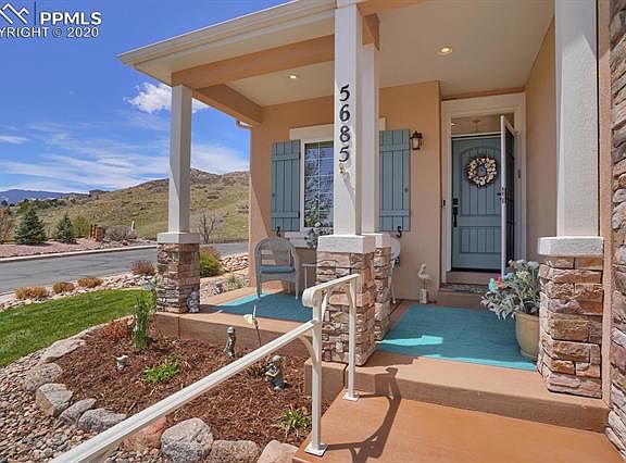 Custom 2,398 SF main level ranch plan home nestled in the foothills of Mountain Shadows. Built in 2013 by Elevation Homes with superior quality upgrades throughout. True main level living with gourmet kitchen, separate dining, breakfast bar, great room, gas fireplace, powder room, master suite and laundry. Huge family room with custom wet bar, gaming area, second gas fireplace, two additional bedrooms, full bath and storage. View the sun rise from the front porch and set over the mountains from the back patio. Pride of ownership beams in this home. Enter through the covered front porch. As you tour the home, note the well designed touches throughout including the gourmet kitchen with upgraded cabinets, waterfall glass, Viking gas range, granite, Moen fixtures, flooring, lighting, wainscoting, cornice boards, soft colors, window treatments, custom closets, laundry room, pebble coated floor in garage just to name a few. Master suite with pocket door entry to the bath. In the basement discover the huge family room, two bedrooms and full bath. Wet bar with the added convenience of a microwave, dishwasher and mini refrigerator. Plenty of room for a gaming table and furniture. Cozy up to the 2nd fireplace in the home. Two car attached garage with epoxy stone coating and suspended ceiling storage. Entertain outdoors on the patio with convenient motorized retractable awning. Designed landscape with bubbling boulder. Beautiful mountain views. Located in the Parkside community of Mountain Shadows, a covenant controlled community with lawn maintenance provided. Conveniently located schools, neighborhood park, Ute Valley Regional Park, Garden of the Gods Park and Blodgett Peak for walking, hiking and biking, grocery shopping, coffee shops and restaurants.
