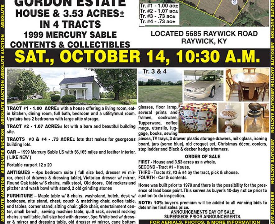 Coming Auction Saturday October 14, 2017 at 10:30am Gordon Estate. House and 3.53 Acres M/L. Plus a 1999 Mercury Sable LS & Contents and Collectibles. Located: 5685 Raywick Road Raywick, KY. 40060