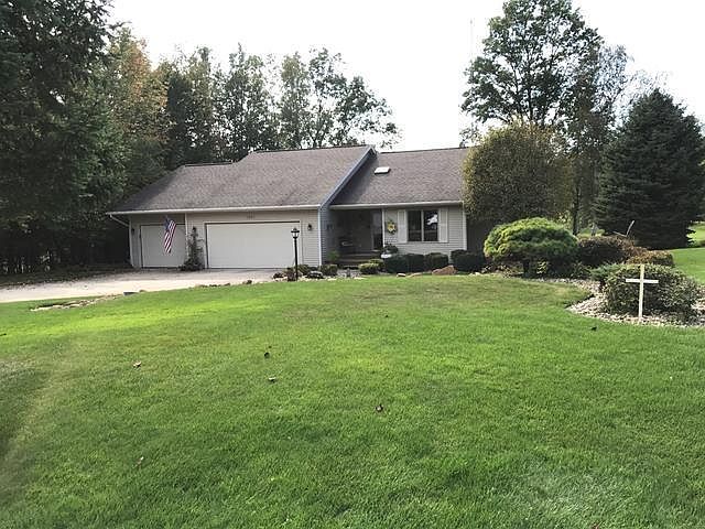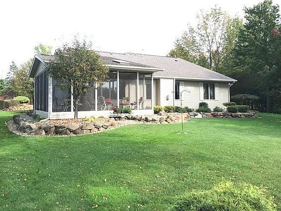 Beautifully maintained and sits in a serene setting off a Championship 18-hole golf course. Unbelievable views of fairway, extensive landscaping with rocks, floral and shrubs. Single level ranch with 3 bedrooms, 2 baths, master suite and open floor plan and central vac. Enter in to a large foyer with Oak hardwood floors, Oak trim throughout. Beautifully decorated. Natural gas fireplace and kitchen with plenty of cupboards and pantry. Enclosed sunroom with a Skylight, over head lighting, carpeted floor, all screened in and spacious to enjoy with your guests. A total of 260 sqft of entertaining space with no mosquitos or put your exercise bike out there and enjoy the golfers. Huge garage with 3 bays. 21x25 for your 2 cars which has an 18ft wide door, 12x35ft bay with a 9ft wide door, deep for a workshop or to store your golf car and pontoon. There is even additional shelves for storage. Ownership gives access to all of Sugar Springs amenities.