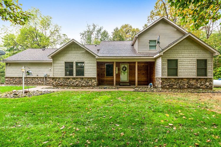Custom built home on 20 wooded acres with hillside views overlooking the extensive wildlife and seasonal views of Mud Lake. Post and beam vaulted great room flows into the open concept kitchen and dinning area. Home features solid hardwood flooring, cabinets, doors and trim. Main floor primary bedroom with on suite bathroom featuring jetted tub, shower, double sinks and walk-in closet. Main floor also contains secondary bedroom den, half bath and laundry. Second floor balcony overlooking great room leads to 2 upper bedrooms and shared full bath. Mostly finished walkout basement offers rec-room, 5th possible bedroom office, large mechanical storage room and many possibilities for finishing. Energy efficient supplemental wood boiler heating and on demand water heater. Large pole barn at street included.