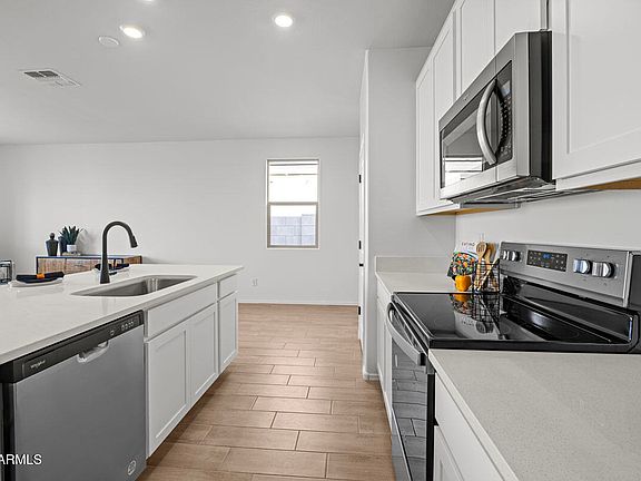BRAND NEW KB HOME! This upgraded single-story home features an open floor plan with 9-ft. ceilings and a spacious great room with sliding-door access to the covered back patio. The kitchen features gorgeous TimberlakeA® cabinets with 42-in. uppers, a center island, quartz countertops and WhirlpoolA® stainless steel appliances. You'll find ceramic tile flooring throughout the common areas and carpeting in each bedroom. The primary suite features an oversized closet, a walk-in shower, dual sink vanity, and an enclosed water closet for added privacy. This home includes a 40-gal. water heater, ceiling fan pre-wiring in the great room and bedrooms, and an energy efficient A/C unit with Wi-Fi-connected ecobee smart thermostat for added convenience and comfort.