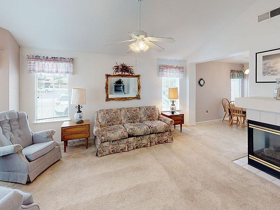 Lovely well maintained 2 bedroom, 2 bath home in a cul-de-sac. Nice, quiet neighborhood. Gas fireplace in living room and covered patio off dining area. Kitchen has wood cabinets, tile counters, electric stove/oven, and dishwasher. Refridgerator, microwave, washer and dryer are included. Extra storage in hallway. Nice walk-in closet in master bedroom with tub/shower in both bathrooms. Tile roof, 2 car garage, and nice size backyard complete this home. Close to schools and shopping.