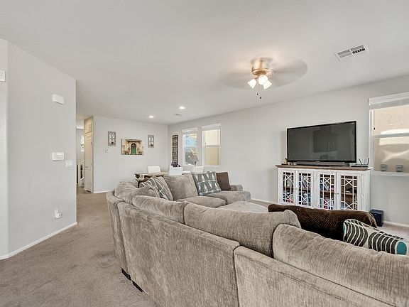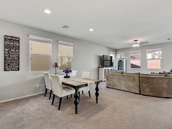 Welcome home to this move-in ready four bedroom, two and a half bathroom home. On the main level, find an open concept family room and dining room, and a powder bath. The kitchen features a breakfast bar/island, corner pantry, gorgeous cabinetry, a reverse osmosis water filter, and granite counters. All appliances are stainless steel including the side by side refrigerator with water dispenser. Upstairs, discover a loft and laundry room complete with a Whirlpool washer and dryer. Three secondary bedrooms share a full bath with separate vanities and a privacy door to the shower area for drama free mornings. The spacious master boasts a sliding barn door to the en suite bath with dual sinks, a make-up counter, garden tub, shower, and walk-in closets. Enjoy the private yard with low maintenance artificial lawn, paver patio, gas grilling stub, and built-in fire pit! This home is conveniently located near shopping and dining and is just a few steps from the huge neighborhood park!