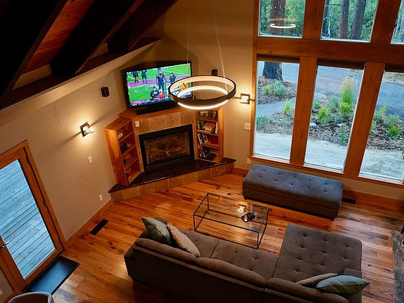 Large windowsLarge deckVaulted ceilingsLevel drivewayModern kitchenHardwood floorsGas fireplace