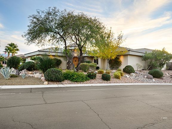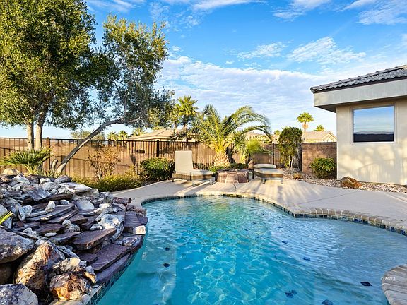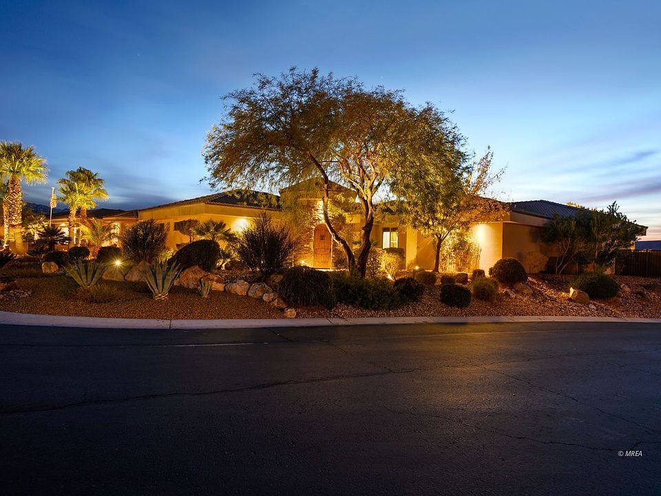 Old World Charm, quality meets warm mediterranean architecture! Stone Entry opens to Courtyard leading guests into the Main House and Casita. Charming mediterranean boasts four bedrooms, two Office/Bedroom Suites, Great Room with bar and Bonus Room with full movie screen and theatre seating. Three features that will warm your heart! A Fireplace warming the atmosphere in the Bar/Greatroom, Pueblo fireplace in Courtyard and Fire Pit by Pool. Gorgeous black granite Countertop combined Sub Zero and Wolfe appliances delight the chef in the family. Spacious master suite with bay window setting area, walk-in shower, soak tub and double vanity. Currently home has a Bar, Movie theatre, 4 bedroom suites, 2 office spaces and Guest Casita. Potential for 6 bedrooms. Oversized three car garage and extra long utility room make an ideal setting. The back yard has a covered patio with large shade trees framing in a spectacular View of the Mesas and Mountains. A Swimming Pool/Spa combination "Spool" enhanced with sounds of water and Fire Pit. Fully FURNISHED! This is a favorite gated community in Mesquite with low HOA and beautiful community landscape! Luxury home, move in re