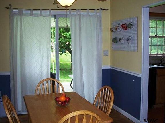 Great neighborhood and comfortable home has large living rm w/Bow window, DR open to covered patio, and kitchen w/all appliances included, and 3 bedrooms on the main level. Most floors are hardwood on 1st floor. Lower level has large FR with a pellet stove and a wall of built ins. Guest room, plus laundry w/shower bath. Shed is included.