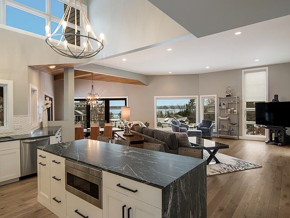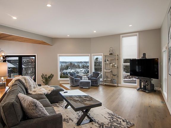 Close to town and just a mile from the base of the Old Mission Peninsula sits this Architect designed custom home with a view from every window, including the primary shower! This 4 bed/4bath home overlooks the tranquil water of East Bay along with 325 feet shared frontage. The Primary suite features vaulted ceilings, large water-facing windows, with an executive walk-in closet and a separate washer and dryer. Vaulted ceilings and floating stairwells are all part of this uniquely contemporary home. The kitchen features all Frigidaire Gallery appliances and granite countertops. The attached heated 3 car garage is heated with natural gas. Bedecked with beautiful features, convenient water access, proximity to the walking trails of Pelizzari Natural Preserve, and a prime location just minutes from every Traverse City amenity, 569 Hidden Drive has everything you need to bask in paradise at home!