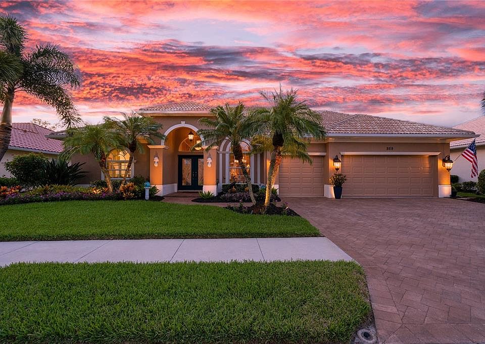 Welcome to Sawgrass; one of the most highly desirable upscale gated golf communities in Venice. Move-In-Ready, Custom, Updated and impeccably maintained residence with over 2370 square feet of air-conditioned living space, plus an expansive pool-side lanai to enjoy your outdoor living space! The popular Aruba model built by J&J Homes, known for quality, generous size rooms and natural light is loaded with upgrades and includes: 14-foot ceilings, crown molding, custom mill-work, 18” porcelain tile set on the diagonal, custom wood cabinetry, aquarium glass, pocket-sliding glass door, large windows, paver driveway and pool-side lanai, plus a three car garage! From the moment you enter the double glass doors into the living room-dining room of this residence you are drawn to the walls of glass with expansive tropical views of the gorgeous pool with spill-over spa, creek, palm tree preserve and the golf course beyond, while still feeling a sense of privacy! The light and bright open floor plan creates a smooth flow through the residence. The stunning Custom Chef’s Kitchen and family room open to the pool with a disappearing glass sliding door makes the pool and outdoor living space another room of the house! The Custom Kitchen with solid wood cabinetry, beautiful thick granite, center island, Sub-Zero refrigerator, GE Advantium double oven-microwave and 5 Thermador cooktop, Bosch dishwasher and pantry with drawers make it a delight to prepare your favorite recipes! The generous size Master Suite has wonderful views, sitting area, two custom walk-in closets, large Master Bathroom featuring an over-sized Roman shower, garden tub, and two custom vanities with granite counter-tops. The split floor plan offers privacy for the two other bedrooms and the second bathroom, also with custom cabinetry and granite counter-top. The outdoor living space is very inviting with the Salt-water Pebble-Tec pool with spill-over spa, paver decking, covered seating area, newly acquired electric awning with accent lighting, new solar heat system, and the pool cage has been updated with stainless steel screws to prevent rust. The entire property has newly installed landscape lighting creating a very pleasant ambiance for your tropical oasis! Other improvements include: Hot water “comfort system” providing instant hot water at all faucets, Mold-Mildew Prevention applied to roof, Garage floor finish with Titan epoxy, Master Bath new tile shower flooring, Plantation shutters, new LG washer-dryer and full exterior paint. The Sawgrass community has an optional golf membership for their 27-hole courses, daytime manned guard gate, community pool, pickleball, and tennis courts. Sawgrass is also a fabulous location! Just a few minutes to The Island of Venice beaches, dining, dancing, shopping, Farmer’s Market, Art Shows, Live Theater and more! Plus, the new Venice Sarasota Memorial Hospital campus is less than five minutes as well as Interstate 75. Also, very convenient access to Sarasota and all area airports! Come live on vacation!
