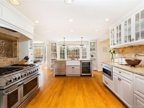 Welcome to 569 Morehouse Centrally located in the heart of Easton, this charming home boosts exceptional views of breathtaking grounds, pond and gorgeous sunsets. Newly renovated chef's eat-in kitchen with custom cabinetry, granite counters, wine cooler and lovely sitting area with a stone fireplace is flanked by a front to back formal living room and large family room with cathedral ceiling. The living room with a grand fireplace leads out to English gardens through a pair of French doors. On the upper level sits four bedrooms, all with new Marvin windows. The master bedroom includes a farmhouse-chic master bath, custom closets and vaulted ceiling. The lower level in-law apartment, including a kitchen, living room, and 5th bedroom has french doors out to the gardens and provides ideal space for in-laws, guests, or an au pair. Entertain outdoors from the multi-level mahogany decks and patios, and enjoy the gardens with flowering trees while watching the sun set over the pond. A fantastic location and an easy walk to the elementary school, library, town hall, local farms and convenience stores. Minutes to the Merritt and Metro station in Fairfield. Just a lovely place to call home
