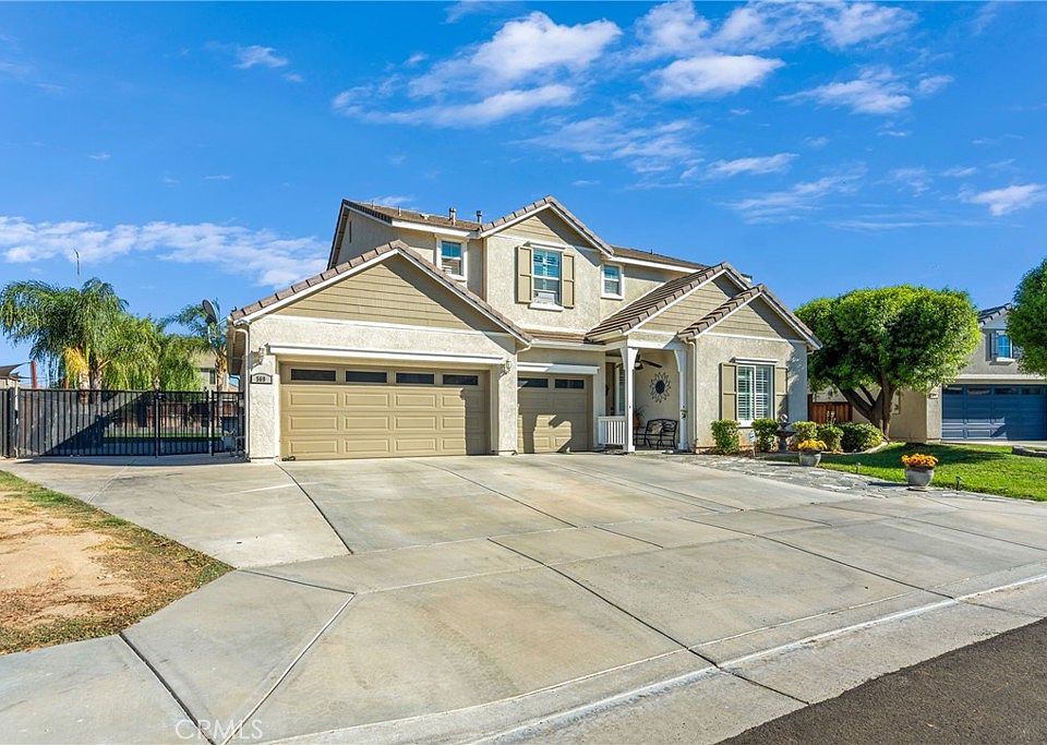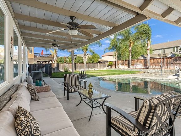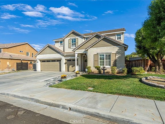 Welcome to this stunning home nestled on a generous lot in the highly desirable northwest San Jacinto area. Boasting 3,127 square feet of elegantly designed living space, this residence offers a blend of comfort and luxury. The thoughtful floor plan features 4 spacious bedrooms and 4 full bathrooms, including a convenient bedroom and full bath on the ground floor. As you enter, you'll be greeted by a formal living room and dining area, perfect for hosting gatherings. The expansive family room is ideal for relaxing, while the chef’s kitchen is a true highlight, complete with a central island, ample counter and cupboard space, a butler's pantry, and a built-in desk for workspace. Upstairs, you'll find three additional bedrooms, a versatile loft area, and 3 full baths. The master suite is a retreat unto itself, featuring a generously sized bedroom and a luxurious master bath with a garden tub and separate shower. The home is adorned with quality details, including plush carpeting, elegant tile flooring, and plantation shutters throughout. The backyard is a private oasis with a sparkling pool and spa, patio and bar area, mature landscaping, fruit trees, and RV parking.