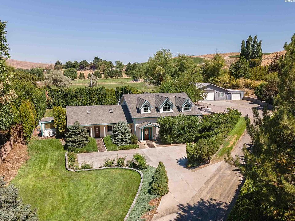 MLS# 255307 This remarkable 1-of-a-kind, custom, 5,229 SF home, with 4 bedrooms & 4.5 bathrooms, sits on 2.5 acres in the middle of wine country. Enter a beautiful tile foyer with an incredible Brazilian Cherrywood staircase leading to a 1250 SF entertainment area with rich Cherrywood flooring. Room could support a pool table, sectional, office nook, children's reading area, and much more. There is a small bedroom or office with bathroom, plus an additional bathroom on same level. Walk out slider to a 336 SF Trex-deck and enjoy a peaceful evening in a tranquil setting with views of wine grapes 250 yards from the top of the property. Main level includes a 750 SF master bedroom/bathroom with soaker tub, beautiful tile shower, gorgeous double vanity, and 2 walk-in closets. Across the hall there are 2 additional large bedrooms & large bathroom with tile shower. Large, tiled laundry room includes brand new washer, dryer & utility sink. Kitchen has all brand-new stainless-steel appliances including propane stove/range, microwave, refrigerator, and dishwasher, brand new sink and faucet, and beautiful oak cabinets. French doors lead to 400 SF formal dining room with radiant Cherrywood flooring that faces a large back yard lined with arborvitaes - perfect for entertaining. Slider leads to large, tiled patio and amazing hot-tub room. Upstairs are 2 separate bonus rooms great for gaming, crafting, or storage. This quality home has solid wooden doors throughout, 6-8 walls with blown in R30 insulation plus foam, water heat pump, 2.5 acres of underground sprinklers, 400 yards of retaining walls, six ft chain link fence encompasses 80 percent of the property, gas fire place in living room, 9 chandeliers tastefully placed throughout home, HVAC system designed so that all transfer systems are within the building envelope, typically one degree temp difference from the top of the house to the bottom. And it keeps getting better, with a 1728 SF detached shop with Red Iron steel construction and 6 concrete epoxy flooring, 6 insulation, propane heater, swamp cooler, industrial lighting, air piping all around, & possible ADU. Additional 864 bay provides so much room to store all the toys, boats, RVs, etc. Adjacent 2.5 platted acres with 40' right away along fence line, 325' engineered (8 50 gpm min) well drilled in 2020 with on demand pump system to 36 gal/min & well house available for add'l $175,000. Great location to build another home!