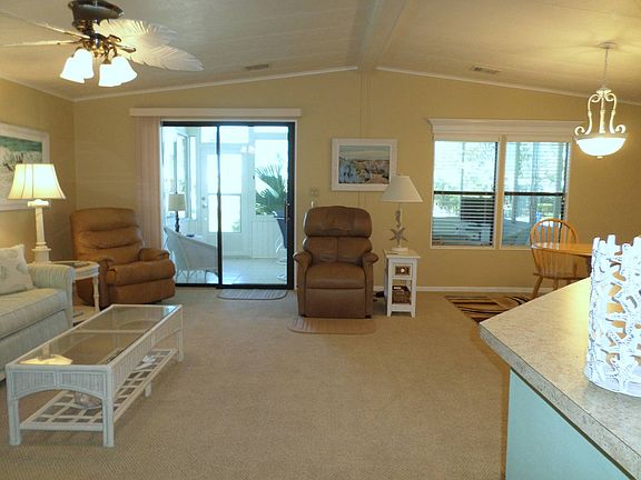 FURNISHED AS PICTURED MINUS A FEW PERSONAL ITEMS. LITERALLY BRING YOUR SUITCASE! Beachy 2 bedroom, 2 bath with a beautiful double sink en suite and tiled step-in shower. Indoor laundry room with utility sink and extra storage, built-in hallway office area, quality tiled Florida room under air and this home is absolutely immaculate!! Camelot Lakes is a gated, resort-style 55+ community where your monthly lot rent of $1371 includes water, sewer, trash/recycling curbside pickup, lawn maintenance, taxes and endless upscale amenities and organized activities. All shopping needs, great restaurants and entertainment are just minutes away via quiet back roads or easy I-75 access. Tired of having everything at your fingertips? Take a 7 mile drive to the beautiful quartz sand beaches of Siesta Key. Throw out a line, take a dip or enjoy an energizing walk along the shore. A never ending supply fresh air, sunshine and some of the nicest people you'll ever meet.