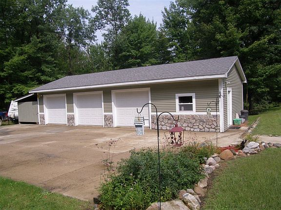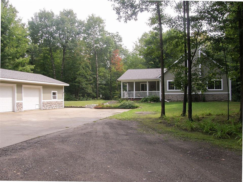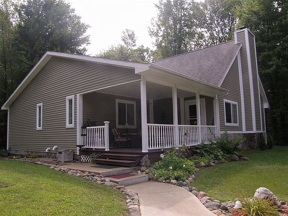 Big, beautiful and secluded comes to mind with this 2010 built home. The home is tucked into a heavily wooded 5 acre lot that is surrounded by woods holding lots of wildlife. The home is over 1,900 square feet with three bedrooms and two bathrooms. It features a huge master suite, living room with vaulted ceilings, wood burning pellet stove, oversize interior doors and a second floor bonus/family room. It has a large covered porch out front and covered deck at the rear off of the kitchen, both with great wood lot views. The detached outbuilding includes room for three vehicles, office and tons of storage. The additional lean-tos provide great dry space storage. All kitchen appliances will stay. City water is a great plus.