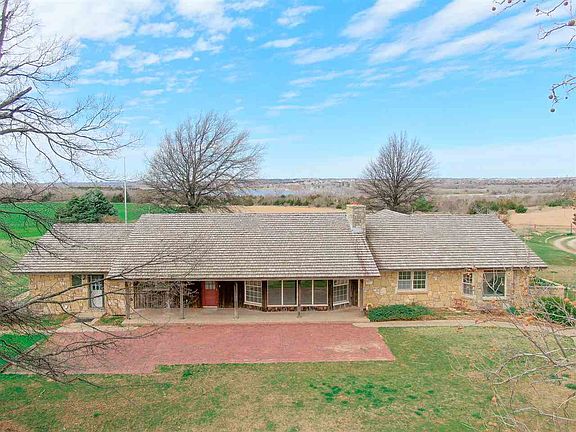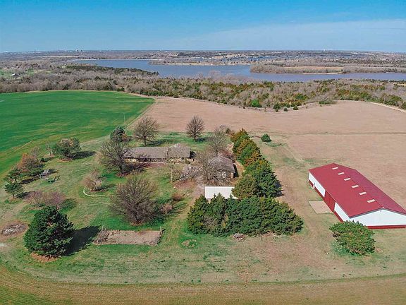 Absolutely beautiful view of Lake Ponca. 54 X 100 Building constructed in 1999 per the county, has concrete floor, Skylights and small office with unfinished bathroom. Finished basement has +-1,054 square feet with wood paneling imported from Norway. Crop land approximately 75 acres is leased until wheat harvest, 1/3 to owner and 2/3 to farmer. Grassland +-40 acres baled for hay. Interior Freshly painted, carpet stretched and cleaned. $2,500 appliance allowance available for acceptable offer.