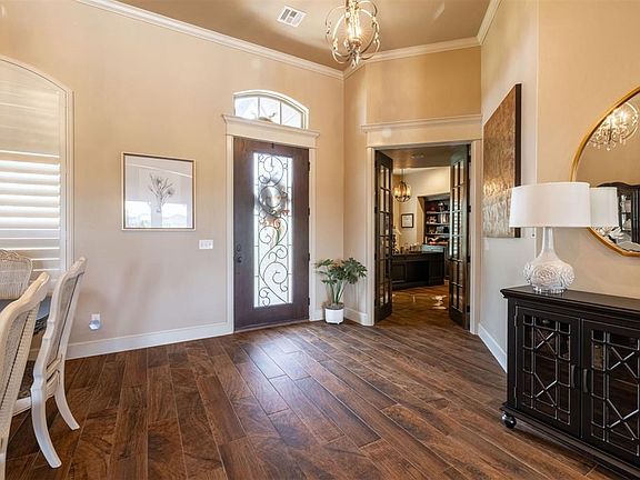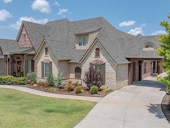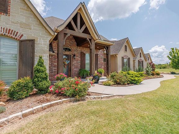 This remarkable home sits on a little more than 1.5 acres of land in a quiet and serene gated neighborhood surrounded by tranquil views. Your private oasis is waiting for YOU! The large driveway featuring a porticoed entrance with brick and stone invites you into this magnificent custom one owner home. When entering, you are greeted with a view of the living room with ample natural lighting. There is a fireplace that welcomes you just in time for cooler fall weather. This home features granite countertops in the kitchen, quartz countertops in all bathrooms, tile and wood flooring, built-in stainless appliances, custom cabinets, and lots of special touches everywhere. The primary suite features a huge soaking tub, walk-in shower, and his & her closets. Guest room with private bath downstairs. 3 additional beds & theater room/bonus area upstairs. Venture onto the covered patio & enjoy the outdoor lounge area, outdoor kitchen, inground pool/hot tub, and all that nature offers while taking in the amazing sunsets. The Seller owns 1/3 of the waterview/pond you see behind the home complete with a private dock for fishing the stocked pond! This unique gated subdivision has 1-3 acre lots, four ponds that are perfect for fishing, walking trails, a club house with pool, wildlife, and beautiful trees throughout. You can't beat this little slice of country heaven that's also so close to town! Norman schools, Norman address, OEC, ONG, and Newcastle water. Appraisal was completed in July 2024 to verify sq footage. Buyer to verify all information.