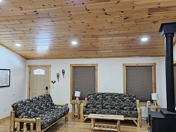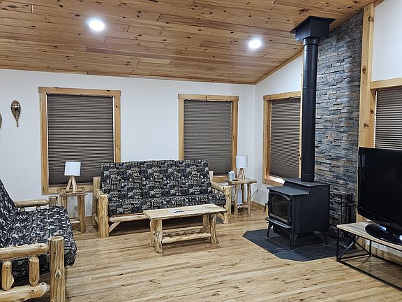 Newer home that is newly furnished in Adirondack style. High end tiled bathrooms and Adirondack style cathedral ceiling in great room. Large covered front porch and back deck to enjoy the peaceful wooded acreage. Large pole barn for horses or ATVs and snowmobile. Property has direct access to state land. Ride your horses, ATVs and snowmobiles right from the property to trails. Renters is responsible for propane cost.