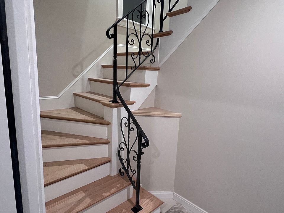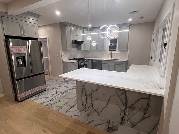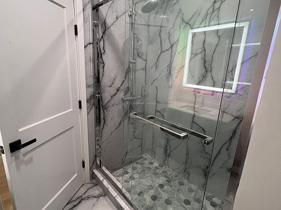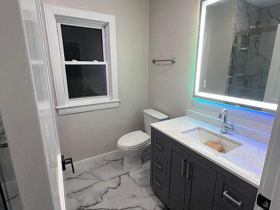 Newly renovated luxury house with solid wood floors, washer and dryer, fully equipped kitchen, and a bathroom with a large LED mirror.