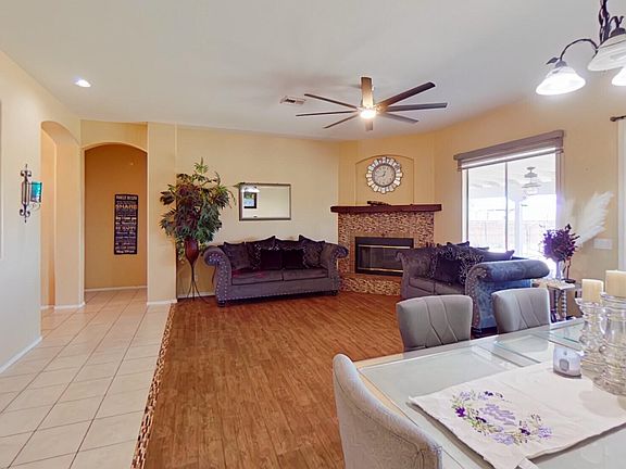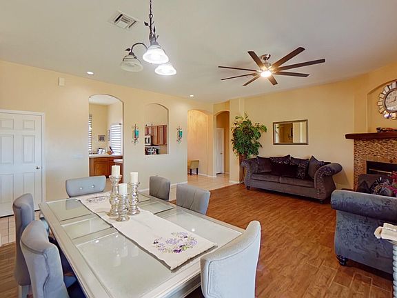 Indulge in a serene style of living in this beautiful 4 bedroom/ 2 bath home, ideally located in the peaceful Rio Rico. This lovely Ranch-style home greets you with great curb appeal and a courtyard. Enter into a spacious living/dining room with desirable fireplace, wood plank tile flooring and sliding door that gives access to an extended porch from which you can relax and admire the lovely views. The light-filled kitchen boasts a convenient breakfast bar and a cozy breakfast nook - the perfect spot for sipping your morning coffee. The master suite features a walk-in closet and an en-suite bathroom with double sinks, garden tub, and a separate shower. The fourth bedroom is an expansive space with concrete flooring and a roomy walk-in closet, perfect for a mother-in-law suite or a man cave. The two additional bedrooms offer wood plank tile flooring and cooling fans. The private lot boasts lovely mountain views and a built-in kitchen, perfect for hosting your weekend BBQ's with friends and family. You'll have ample parking space for all your toys too! So why wait? Come and make this your dream home