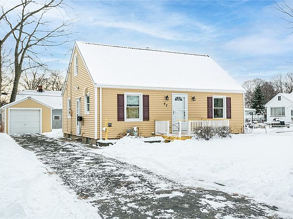 Welcome to 57 Bancroft Drive! A beautiful cape cod nestled on an adorable, neighborhood street with a spacious backyard amongst a detached garage! Upon arrival you will surely admire the curb appeal with the newer vinyl siding, newer doors & vinyl windows, brand new roof (Stellar Roofing, 2024), gutter guards (Leaf Filter) & a freshly painted, open front deck! Raspberry & blackberry bushes align portions of the lot alongside an adored, walnut tree. Inside you will find a lovely, eat-in kitchen with newer appliances & a pantry, guiding you to a bright and beautiful living room with tons of windows! There are 2 spacious bedrooms on this level, (one of which has laundry hook ups) & a sparkling, full bathroom. The bone dry, full basement is massive with high ceilings & a newer, washer and dryer! The walk-up attic offers tons of potential for more finished space and would make an incredible additional bedroom, office, playroom, or whatever your heart desires! Additional mechanic info: Furnace 2015, A/C 2018, Garage Roof 2019! All you need to do is move in! This home is close to tons of restaurants, parks, shops & more! Offers are due Mon, 1/27 at 3pm!