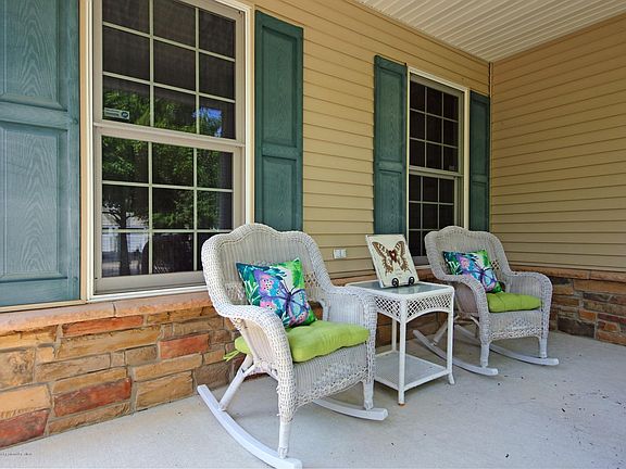 Lovely expanded Devon model backing up to the woods! This home boasts HW floors in Dr, FR & office. Kit has ceramic tile floor, granite countertops & tumble marble backsplash, kitchen opens up to a two story FR with gas fireplace & recessed lighting. Sliders off FR to a private paver patio w/awning. Master bedroom with tray ceiling & two walk-in closets. Master bath has double sinks, soaking tub & shower. Office has French doors. Spacious second floor bedroom has a walk-in closet. There is also a third bedroom. Still time to enjoy your resort lifestyle with the outdoor pool, hot tub, tennis & bocci counts. Inside you have a gym, game room, library, billiard and community room. You won't be disappointed!!