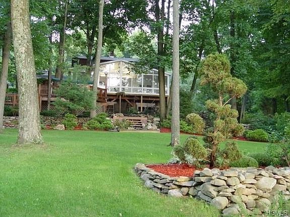 Gorgeous, very well kept, Dutch Colonial with Lake Frontage to the beautiful Lake Nirvana. Situated on an amazingly landscaped lot with stone walls, decks, 2 waterfalls, 1 with 4 tiers and one with Koi Pond. This immaculate home has 3 bedrooms, 2 1/2 baths, cozy living room with brick faced fireplace, formal dining room and sizable kitchen. Also featured are hardwood floors through out entire house with hardwood under the carpets in the upstairs rooms and ceiling fans in all rooms except the dining room. Relax in the oversized four season heated sun room with cozy gas stove and floor to ceiling windows providing a spectacular year round view of the lake. Full unfinished walk out basement for future expansion with wood burning stove and water softener. 12X20 shed also included. Walk out right to the back yard and access to the lake. This home is a MUST SEE. Located in the desired Minisink Valley School district. HOA is $350/year for the maintenance of the lake.