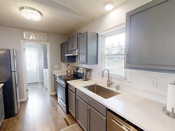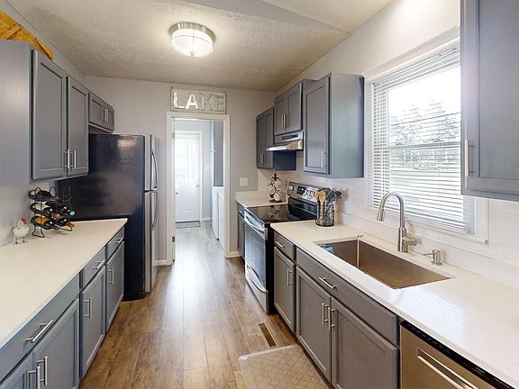 Completely remodeled water view 3 bed, 2 bath home with detached garage, paved driveway, and leased boat slip. A great central lake location near grocery, shopping, restaurants, brewery and more. It has everything you want in a lake escape. Newly remodeled with a look you will love. New kitchen cabinets & quartz counter tops, new stainless steel kitchen appliances, lighting fixtures and ceiling fans, new waterproof laminate wood flooring throughout, new high capacity washer and dryer, new pressure tank, new interior doors, new paint, new porch screens, new roof on house and garage, new front door, new fire pit, new concrete pad for additional parking, new plumbing with Pex-A. The crawl space was encapsulated and conditioned, gutter guards installed, and the decking has been repaired and resealed. Septic pumped in Sept. 2020. All with a level yard great for games and making memories. The property also boast high speed fiber internet. Some furnishings convey.