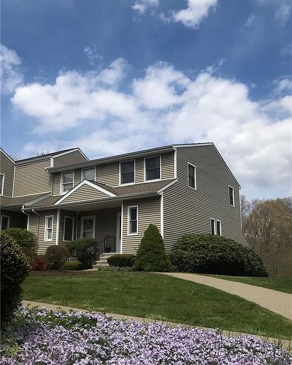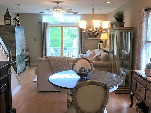 Outstanding Cobblestone Run End Unit with private garage! 2 bed 2 bath maintenance-free Townhouse with finished basement recent updates throughout! Central Air, Newer stainless steel appliances, HVAC system, sliding glass doors, custom lighting, garage door more! The bright open floor plan is flooded with natural light perfect for entertaining! The kitchen boasts a breakfast bar, custom lighting, and modern tile back splash. The elegant combination living/dining area has updated flooring and large sliders with transom window leading to your private deck-freshly power washed painted- ready for the season with views of the lush open green space! Upstairs hare 2 generous bedrooms, double vanity full bath, skylight lots of closet space. The full walkout basement is partially finished and also has a large utility/ laundry room with freestanding sink and additional storage. Step outside to enjoy a large lawn and beautifully manicured gardens. The complex is privately tucked away yet centrally located -minutes to all area amenities shoreline attractions with easy highway access.