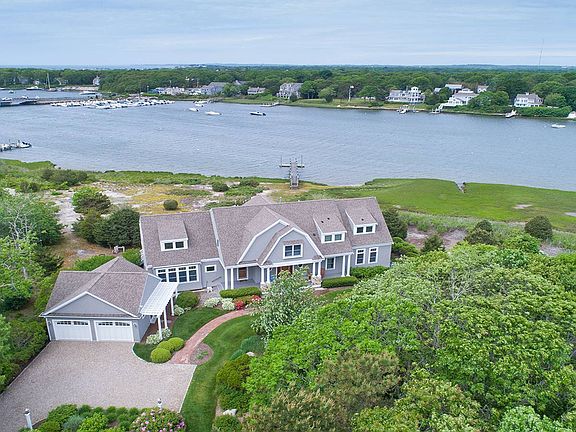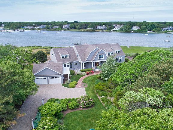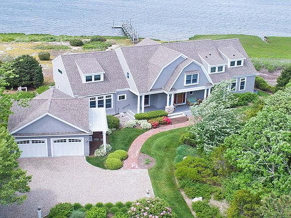 Paradise! Welcome to this Contemporary style waterfront home on a private 1.38 acre lot with licensed dock and magnificent water views of Green Pond. Enjoy the mesmerizing westerly views from almost every room in this 5 bedroom and 5.5 bath home. First level has an open floor plan, gorgeous chef's kitchen, large center island, granite tops, stainless steel appliances, family room with gas fireplace and dining area a great space for entertaining. First floor also features full bath with tiled shower, half bath, laundry, large walk-in pantry, mechanical room and second family room/office. French doors are leading to an expansive deck across back of the house. Second floor offers a master bedroom, private bath with tiled shower, three guest bedrooms, en-suite guest bedroom, laundry, office/study and 3 additional bathrooms. Beautiful hardwood floors throughout the house. Four bedrooms have panoramic views. Enjoy grilling, entertaining, relaxing, outdoor dining on the deck and enjoy the most breathtaking sunsets. Mature plantings, cutting beds and lush lawn complete the private outdoor space. Two car detached garage with storage above. It's a short distance to Green Pond Marina and Menauhant beach. This is truly a unique and impressive waterfront home in a quintessential Cape Cod setting.