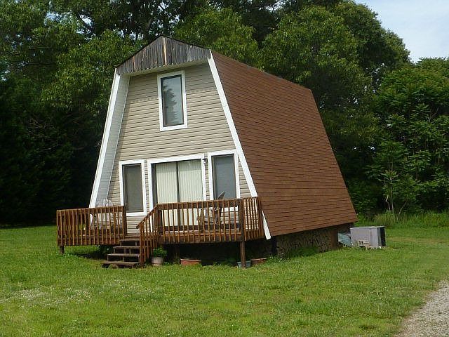 Cute A-frame on level lot with loft bedroom, decks on front & back, pantry, 2 ceiling fans, extra insulation, 8 x 12 Amish utility shed.