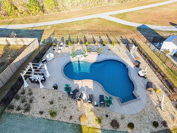 Dreaming of your own backyard oasis? Relax & enjoy the fabulous inground salt water pool w/waterfall in landscaped backyard. Bright & open floorplan has hardwood floors, coffered ceilings, upgraded trimwork & lots of natural light! Kitchen w/quartz & ss appliances opens to living room w/gas log fireplace. 1st floor owner's suite w/luxury bath. Bonus/media room. 2 car attached garage & 2 car detached garage w/finished apartment w/kitchenette & full bath. Backs to woods & stocked pond w/walking trails.