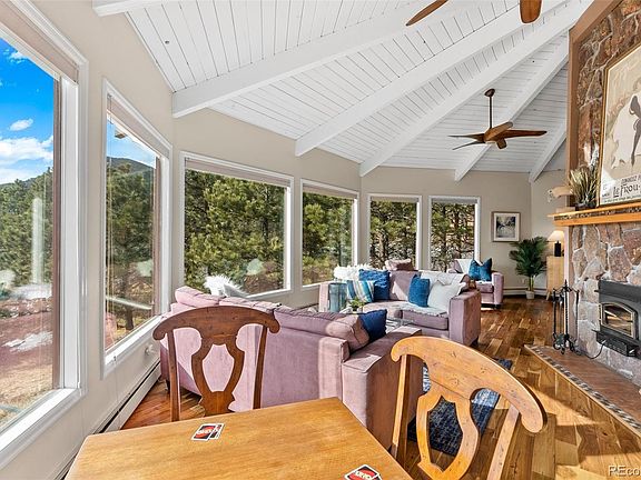 If you're looking for the quintessential mountain home, look no further! This one-of-a-kind custom home features 4 bedrooms, 3 bathrooms and floor-to-ceiling west-facing windows- showcasing the breathtaking snow-capped high country views & stunning sunsets. With its unique sun drenched design, this home's open floor plan boasts such details as exposed wood beams, two dramatic moss rock fireplaces adorning the octagonal family and living rooms with vaulted ceilings, acacia hardwood floors, and access to multiple decks for true outdoor living on 1.4 acres. You'll enjoy economical energy bills with the assumable solar panel system, double & triple paned windows, and Nest® energy saving technology throughout the home.