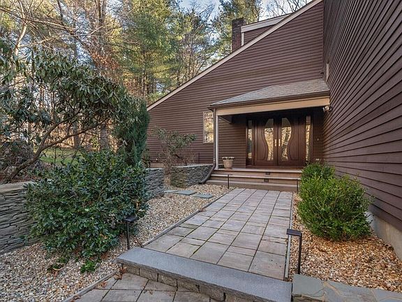Exquisite Contemporary with woodland views from every window, situated on a secluded country lane. This property has significant upgrades from top to bottom inside & out! The gunite pool & fenced yard becomes an oasis with absolute tranquility & calm but within minutes of amenities. Additional highlights include a magnificent mahogany front door imported from Honduras, lovely elevated fireplaced living room, a spacious dining room open to a sleek designer kitchen with expansive island leading to a large deck overlooking the glorious grounds. The primary suite on the second level has a private deck. There are three additional bedrooms on the other levels. In-ground heated pool, newer fencing, cozy firepit & beautifully designed stone walls provide a sanctuary of sophistication & style! A great value in a great community with lots of privacy connected to nearby walking and riding trails!